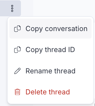 Chat-Optionen – Zusätzliche Optionen für Chats, darunter die Option zum Kopieren des Chats, der Chat-ID, zum Umbenennen des Chats und zum Löschen des Chats. Gelöschte Chats können nicht wiederhergestellt werden.
