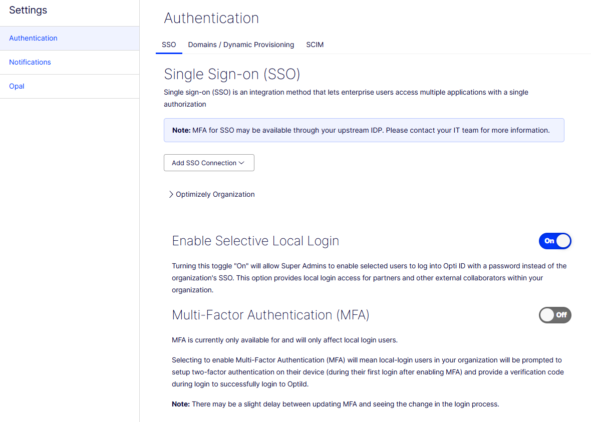 Go to Settings > Authentication > SSO to show your options. If you have an SSO setup, be aware that you cannot adjust your MFA settings: