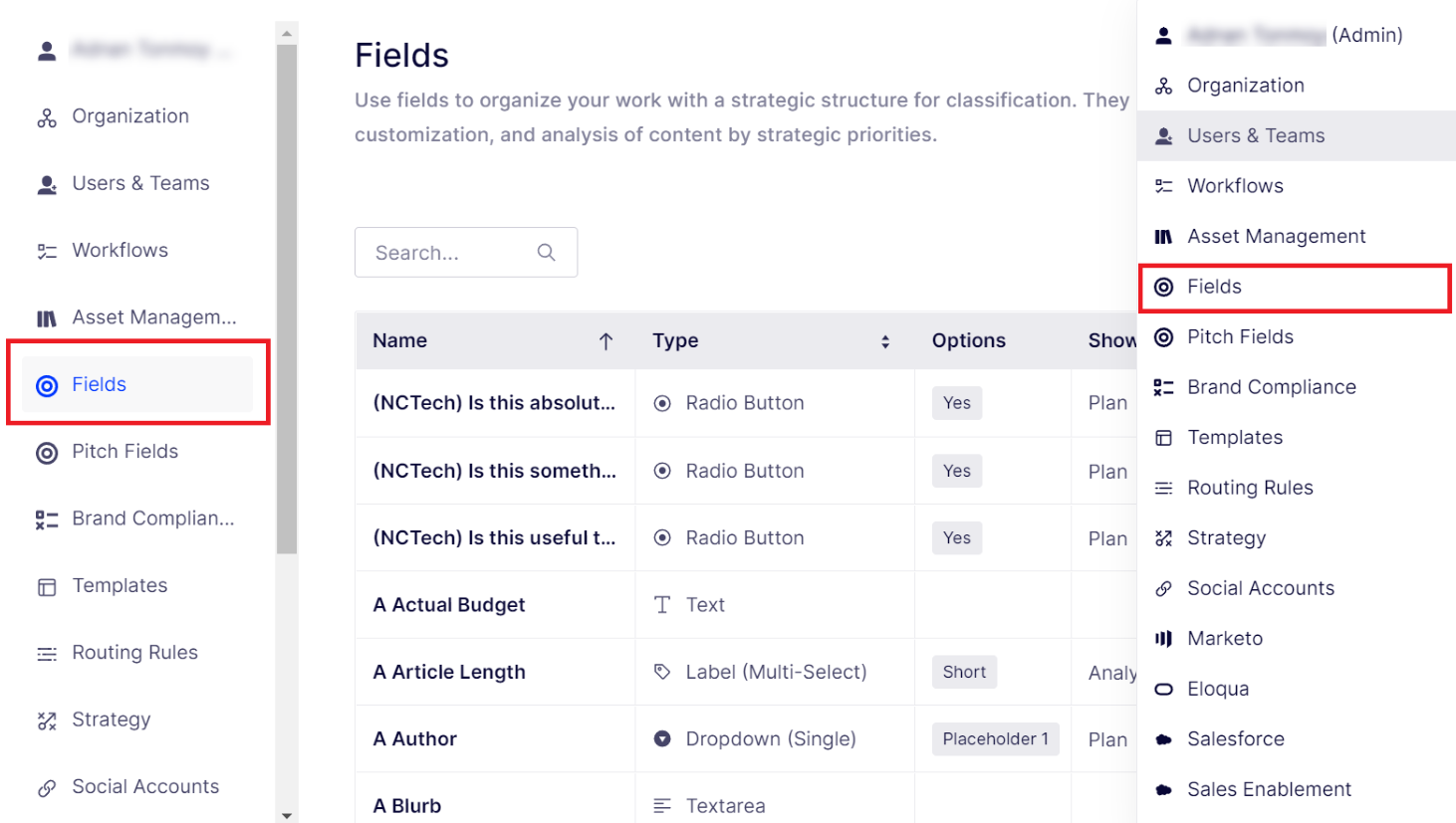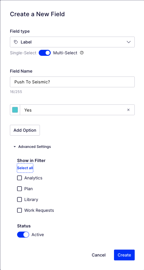Adding fields is the same process as setting up the label to indicate CMP should push the asset to Seismic; change the field types, names, and options values to suit it. See Taxonomy Support Pages for details on how field inheritance works, plus how to set up and manage fields.