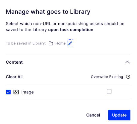 - Push assets after completing tasks, or one at a time or in bulk from the library