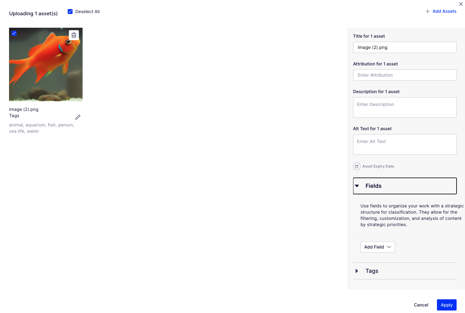 After you select and upload assets, you should complete the relevant field values that Seismic needs.