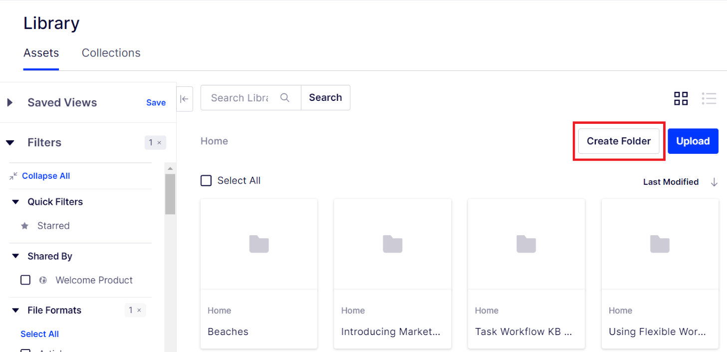 Alternatively, you can add assets directly to the library in any folder by clicking Upload.