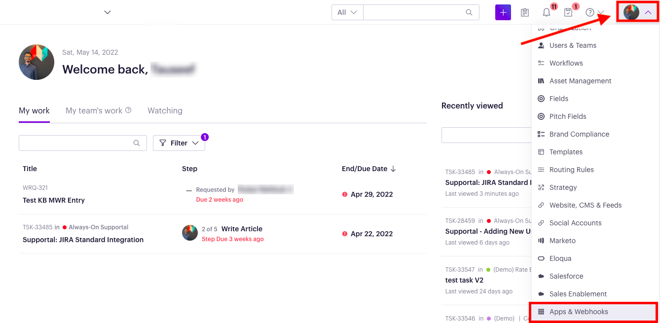 - Next set up a CMP Webhook – Go to your avatar > Apps & Webhooks.