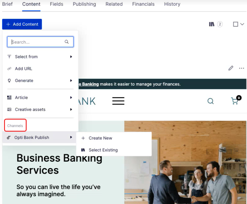 When you integrate CMS and CMP, the Add Content drop-down list in CMS includes a Channels section. If you have one or more CMS sites set up, you can select the site to which you want to publish content.