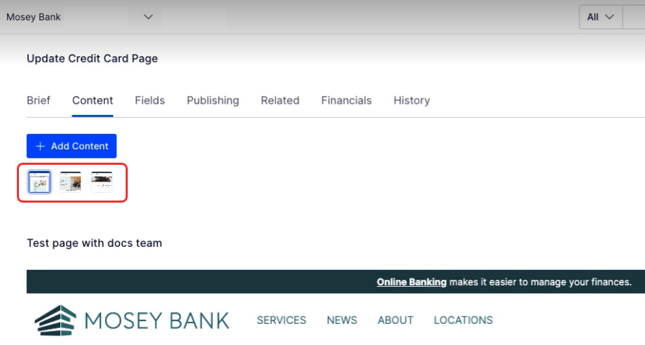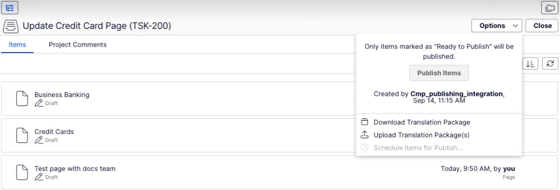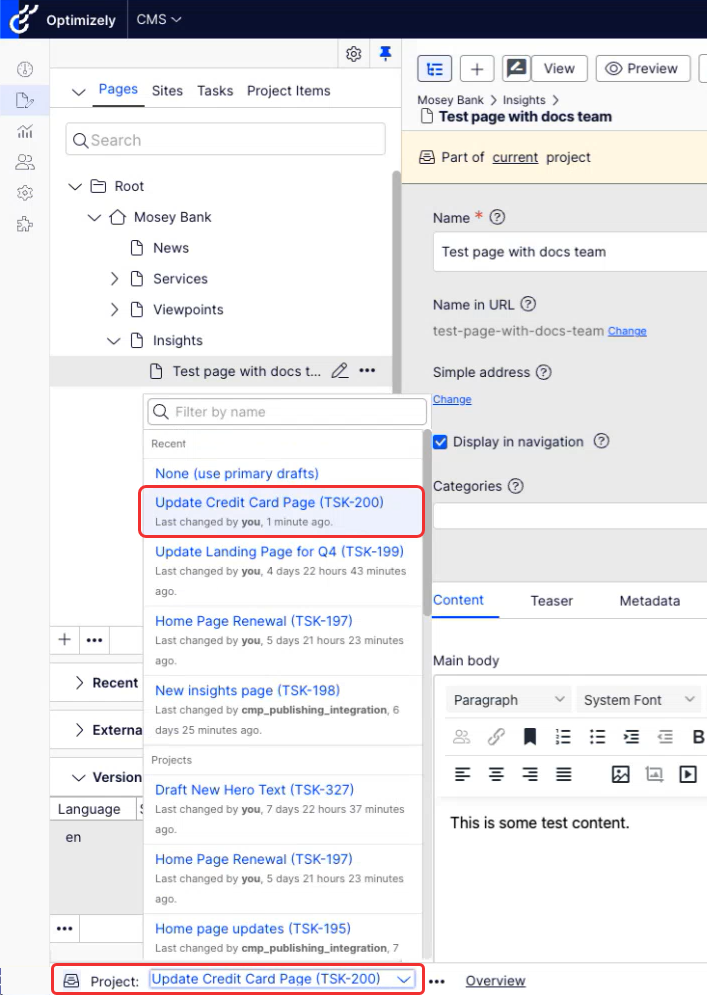 The Update Credit Card Page (TSK-200) project has multiple pieces of content (Business Banking, Credit Cards, and Test page with docs team). You can perform project operations from the Options drop-down list.