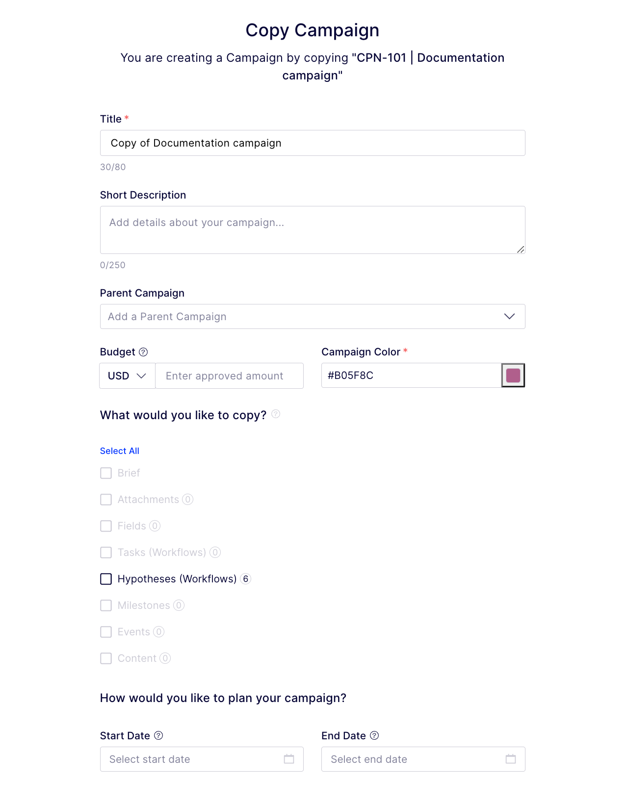 Enter the Campaign Title and select the Campaign Color to identify your new campaign. Optionally, select a Campaign Template, enter a description, select a campaign parent, start and end date (if the campaign is not open-ended), budget, and add any attachments or fields. Click Create Campaign.