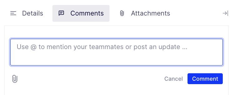 To submit a comment, click on the comment field that says, Use @ to mention your teammates or post an update... and write your comment. Click Comment. Posted comments display below the comment box