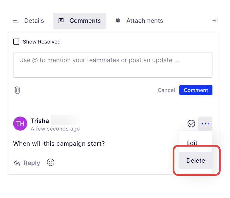 Click View Comments to display the Campaign Details, Comments, and Attachments panel, where you can enter and resolve comments directly. Click Show Resolved to display the comments that were marked as Resolved.
