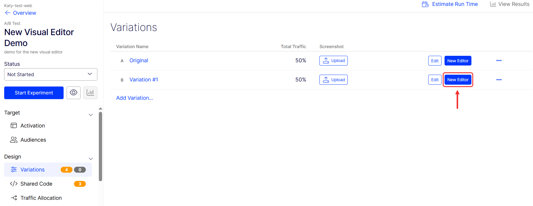 Go to Design > Variations within your experiment or campaign and click New Editor for the variation you want to edit. You can also create a variation and open the Visual Editor by clicking Add Variation.