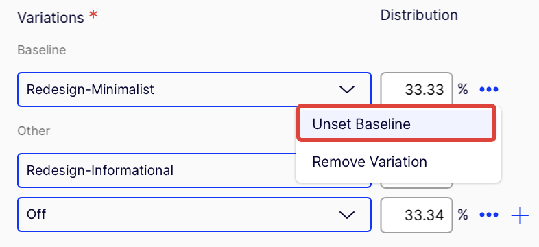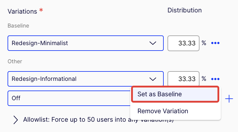 (Optional) Click More options (...) for a variation and select Set as baseline. The baseline is the "original" or "control" variation against which Feature Experimentation compares the other variations to measure performance. If you do not select a baseline, Feature Experimentation arbitrarily selects a variation as the baseline.