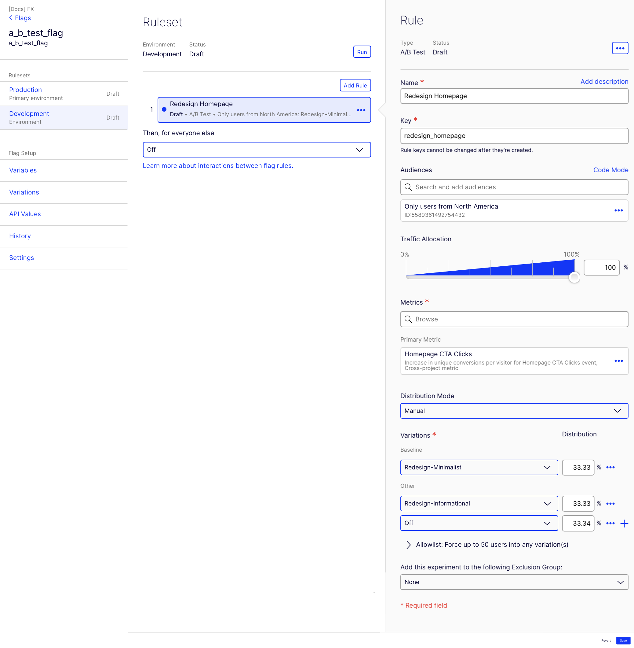 - (Optional) Click Allowlist: Force up to 50 users into any variation(s) and enter the User ID. See Allowlisting.