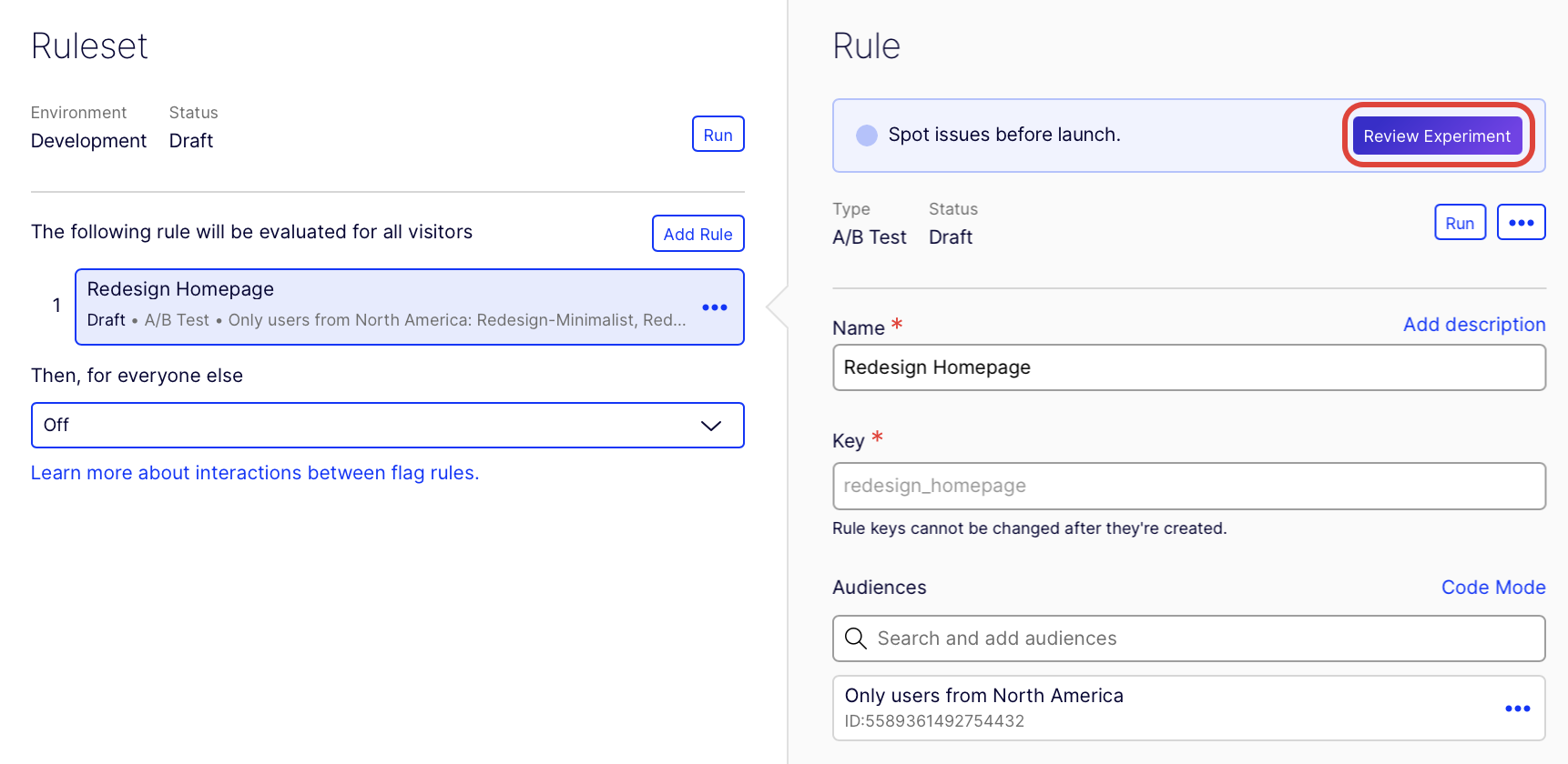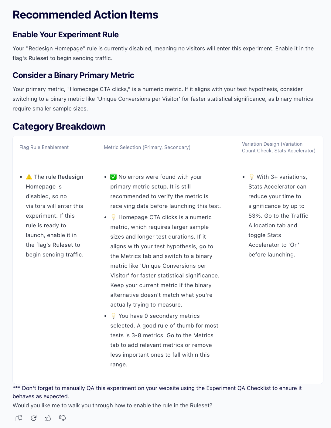 Before implementing your A/B test rule, you can use Optimizely Opal to review your experiment configuration and recommend changes to maximize your odds of reaching statistical significance.