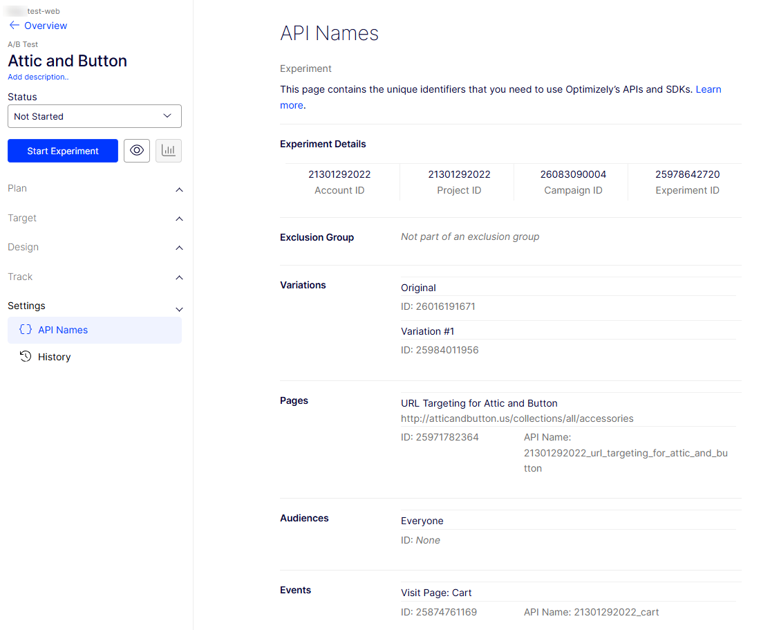 The API Names tab contains various unique identifiers, such as the Account ID, Project ID, and Experiment ID, that you can use with Optimizely Full Stack (Legacy) APIs and SDKs.