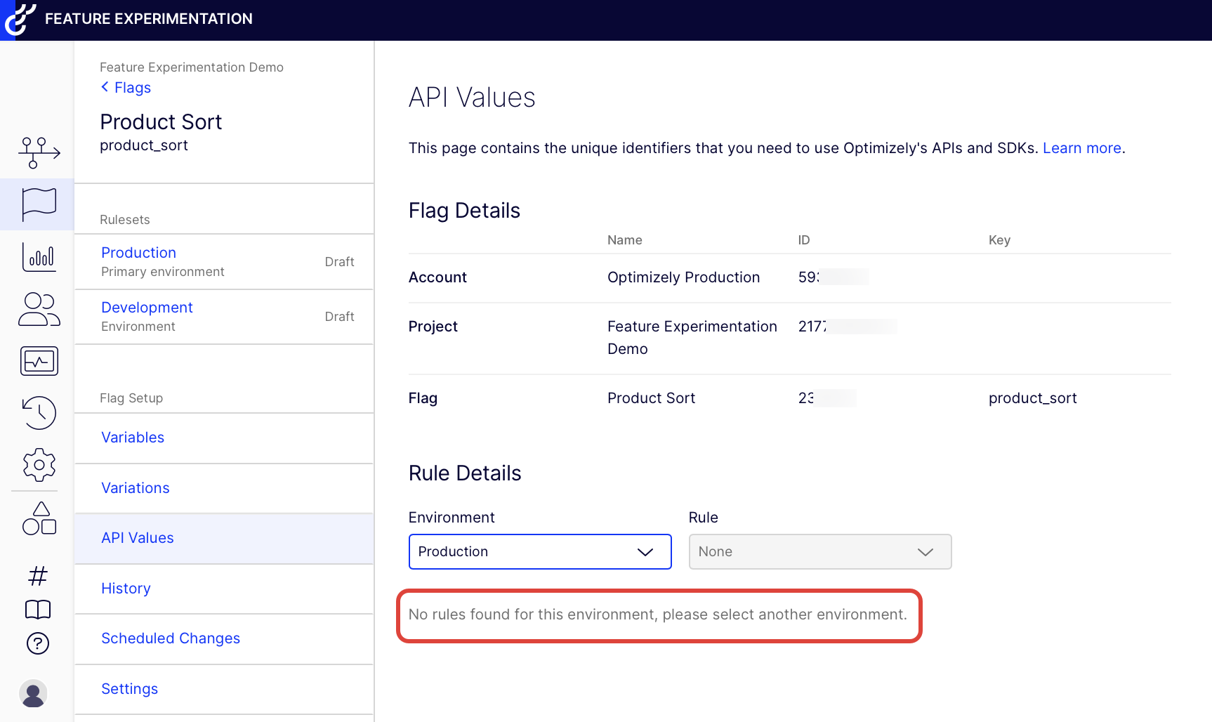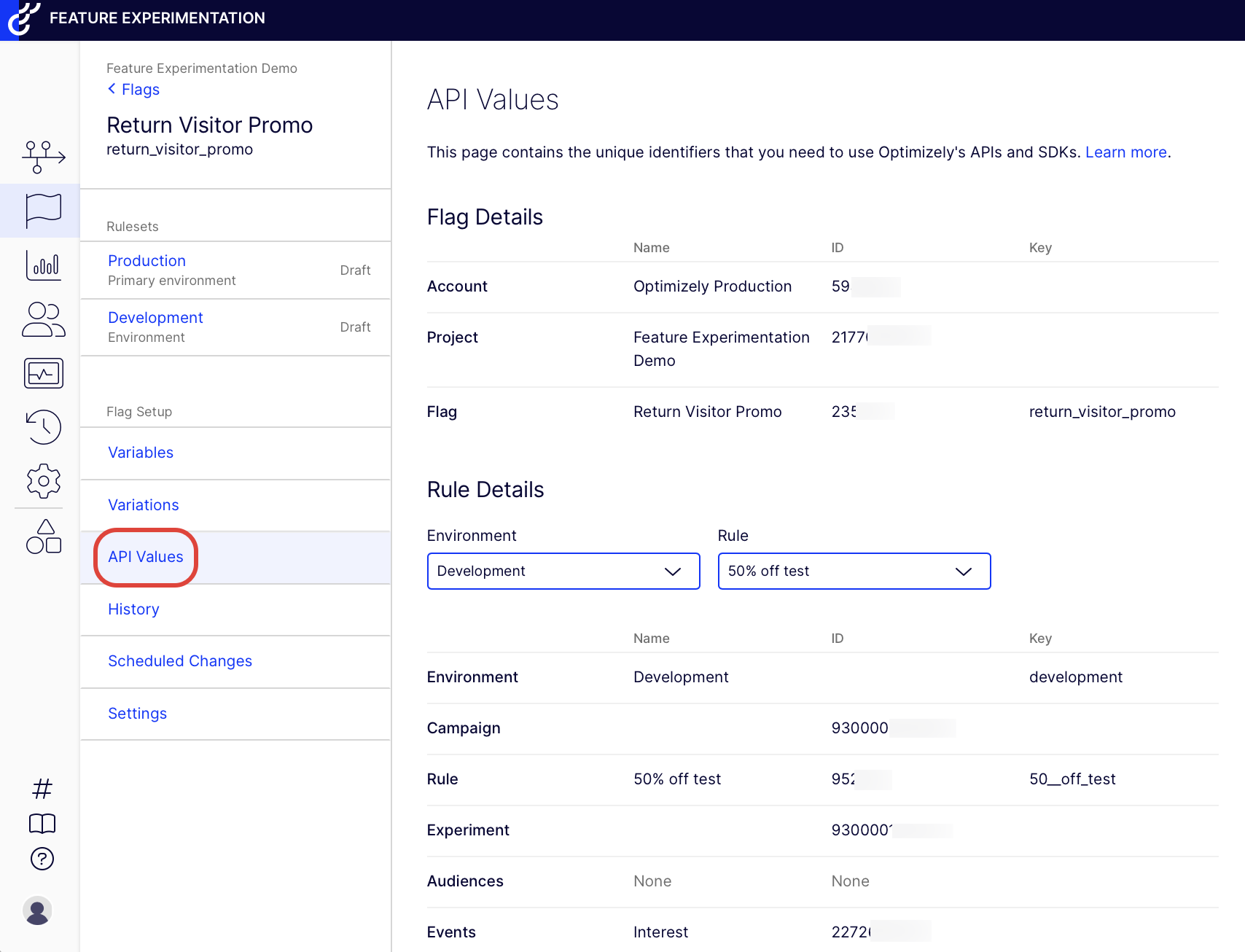 This page contains various unique identifiers and keys for your flag and rules that you can use with the Optimizely Feature Experimentation APIs and SDKs.