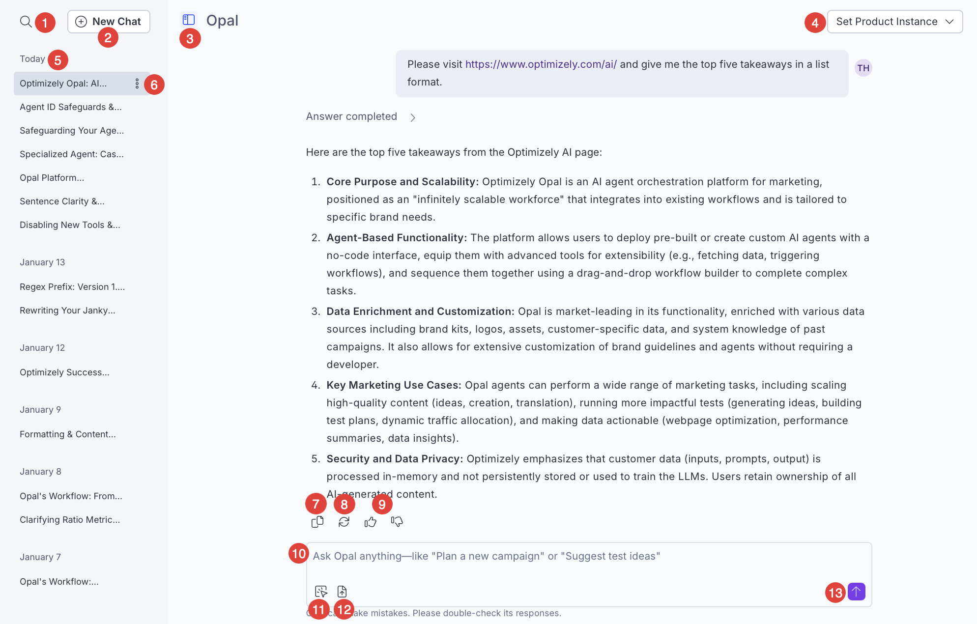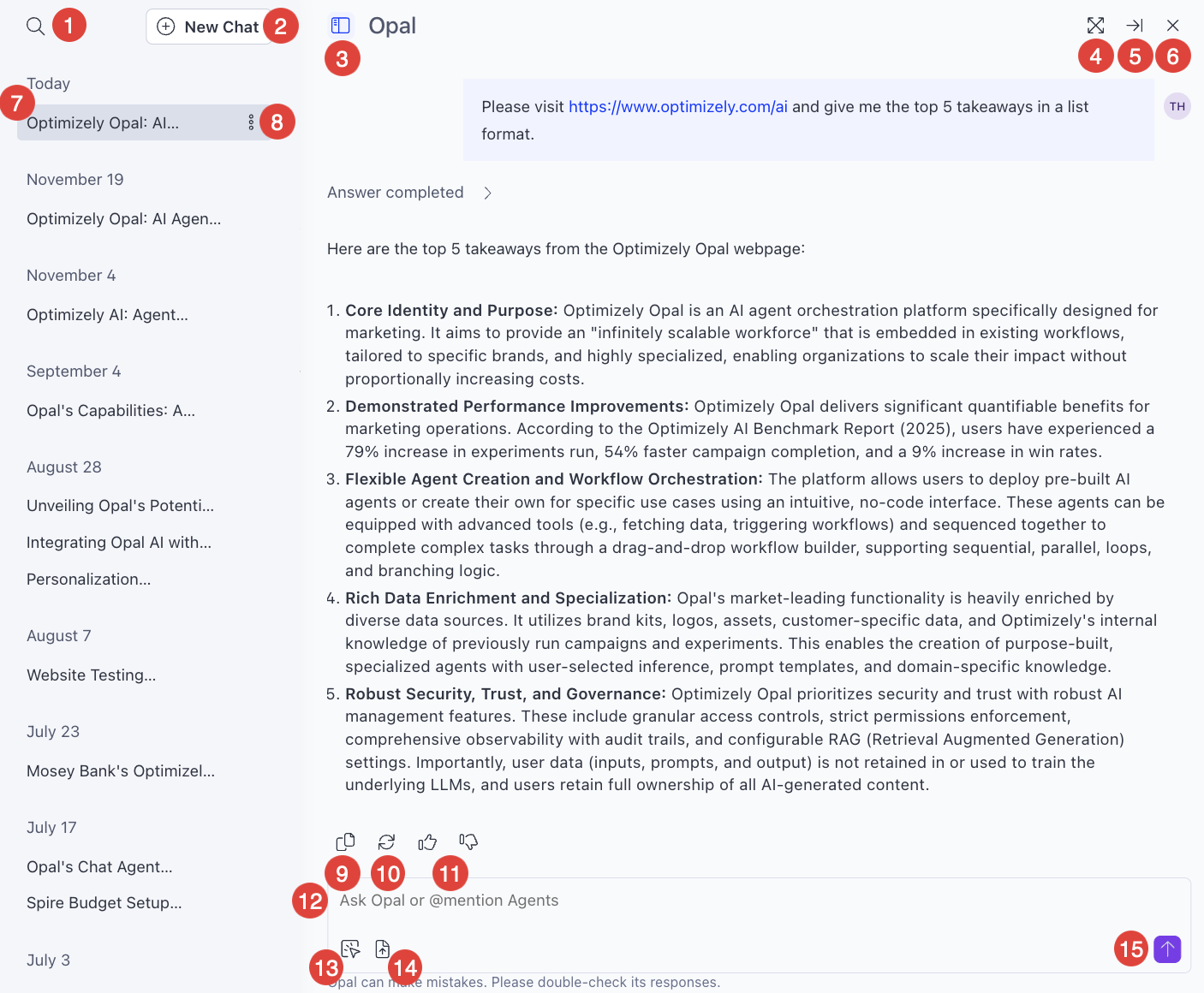 - Chat history – Go to previous chat threads with Optimizely Opal.