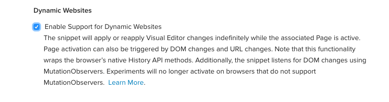 However, unlike static sites, SPAs do not fully reload the page to change the content that a visitor sees. Instead, elements are changed or added to alter the site experience as a visitor explores. This means that two seconds is often not enough time to capture when an element loads on a SPA to apply the visual changes through an experiment.