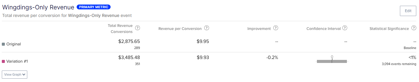 With the metric builder, you can decide the best way to break down data on the Optimizely Experimentation Results page using different combinations of the revenue events you have created. To demonstrate this, the following sections use the previous widgets and wingdings example.