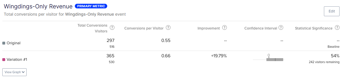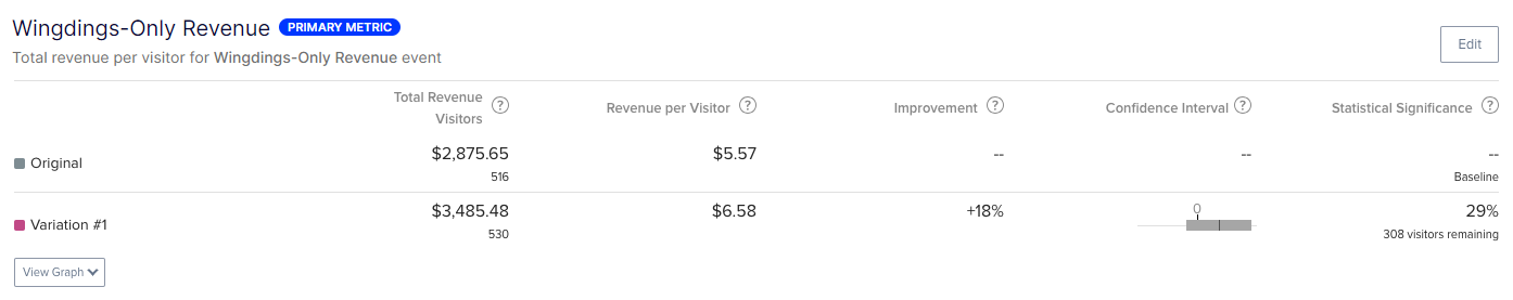 Comparing the results for the wingding revenue examples, the dollar amount is the same, but the data is much different. In the revenue per visitor example, you are closer to statistical significance, and the total improvement is much greater.