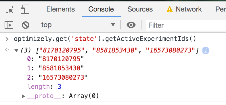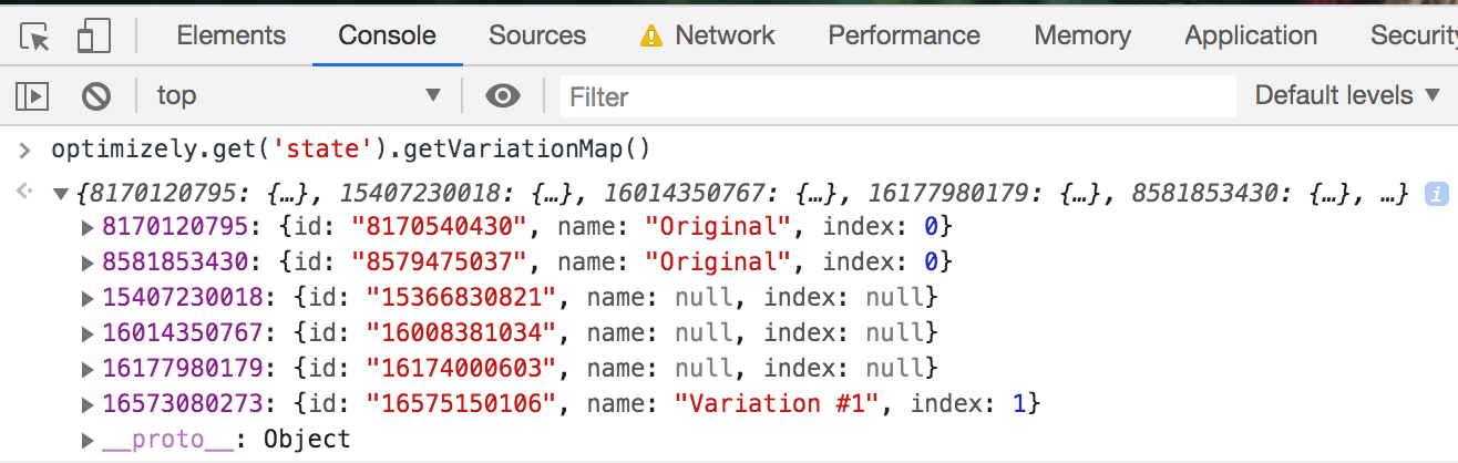 optimizely.get('state').getVariationMap()into the console. This returns an object containing the experiment IDs that were activated at some point in the past, along with the variation ID you were given. This list is not indicative of active experiments on the page. - Enter