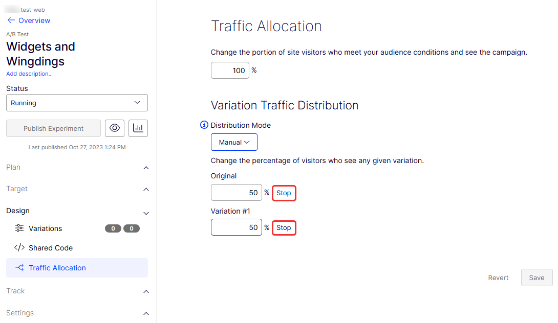 You can stop sending traffic to a specific variation during an experiment. In the Traffic Allocation view for a variation, click Stop next to the variations you would like to stop.
