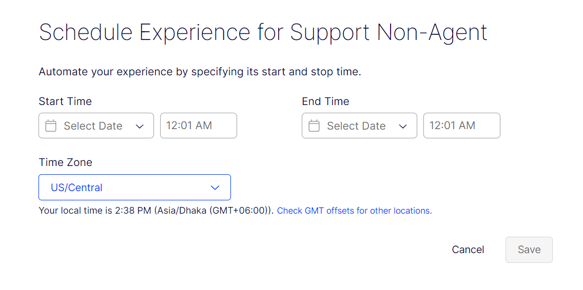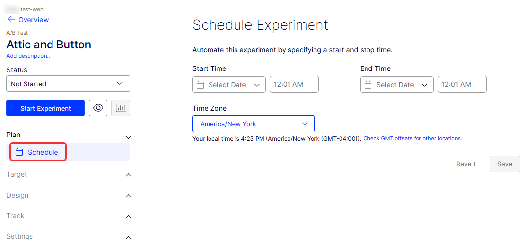 Use Optimizely Experimentation to schedule experiments and campaigns to start and stop at a specific time. You receive an email notification when an experiment or campaign starts or stops. The start and end times are based on the time zone you select. You do not need to calculate GMT offset to schedule your experiments accurately.