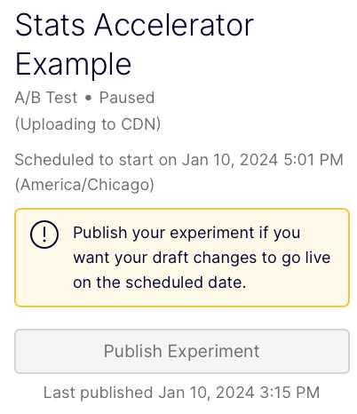 If your experiment has unpublished changes when you create the schedule, publish them before the scheduled start time for them to go live.