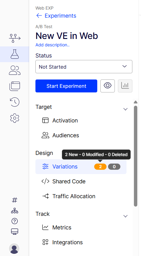 - Streamlined workflow – Changes are non-destructive and only visible for the experiment's duration. It includes a Variation Code Editor for custom JavaScript or CSS, and you can cycle through variations to view changes with clear status indicators