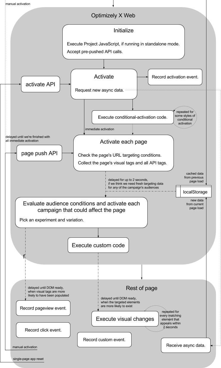 When the snippet loads on the page where your experiment lives, it applies API calls in the window.optimizely array and runs Project JavaScript. When the snippet activates, it evaluates the URL targeting in the project. The snippet also can be reactivated after this point using the activate API call. Optimizely Web Experimentation and Optimizely Personalization pages include targeting conditions for the pages on your site and an activation mode (optional), which determines when the page targeting conditions are evaluated.