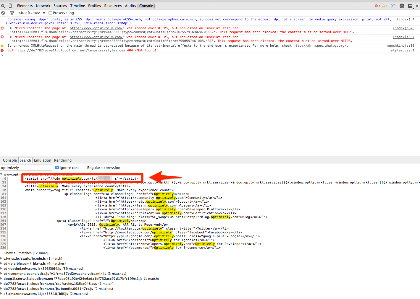 First, check that the snippet is implemented on the page. You can do this by typing 'optimizely' into the JavaScript console. This example uses Google Chrome for troubleshooting and testing.