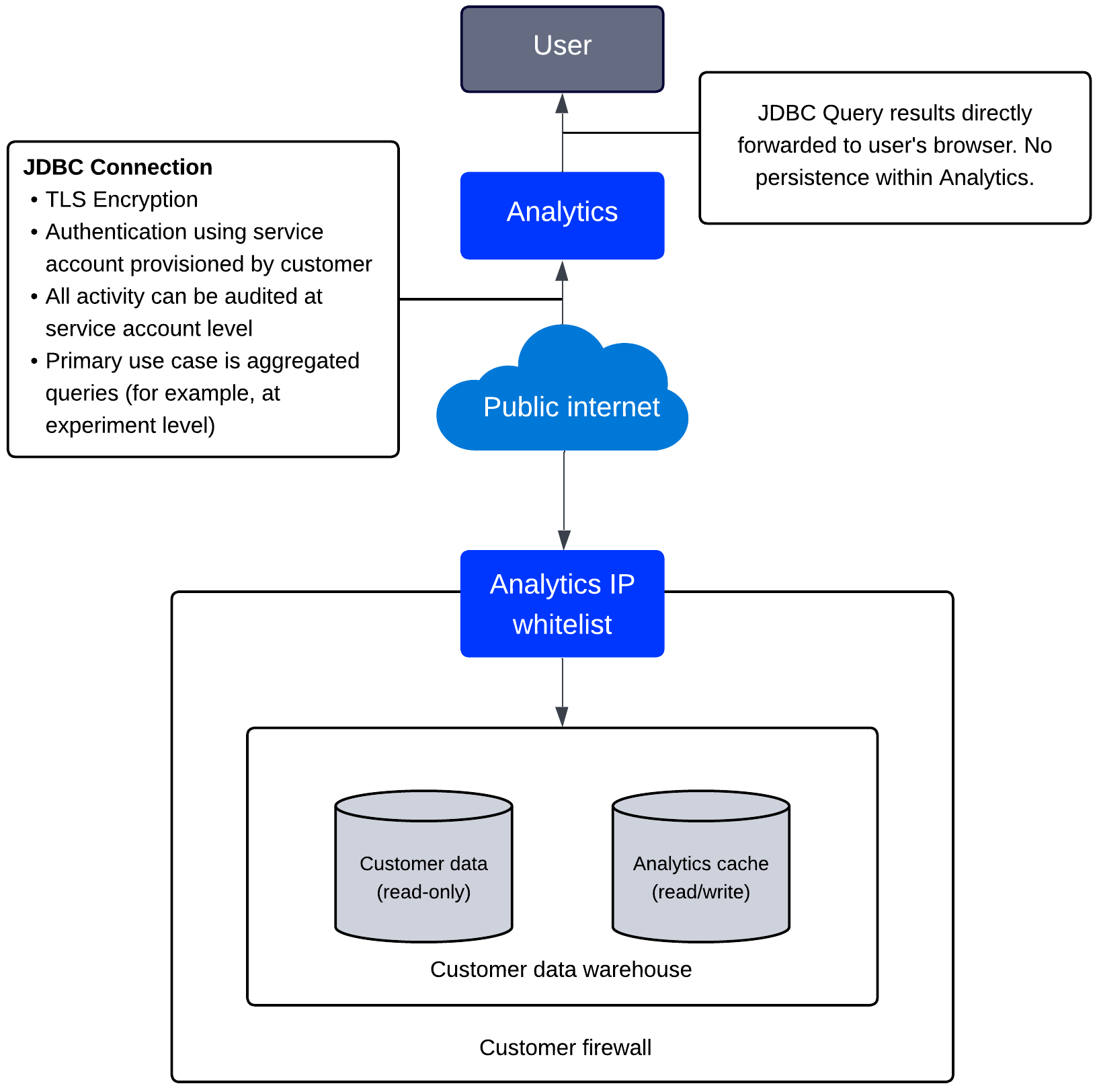 Optimizely Analytics is a fully-hosted SaaS application that connects to a customer’s warehouse using a service account provisioned by the customer. You retain full control of what data is made available to Optimizely Analytics, and you can revoke this access at any time due to security concerns. Modern cloud warehouses provide rich tooling that lets you maintain an audit trail of every query that Optimizely Analytics executes.