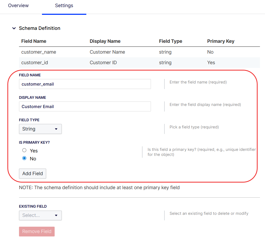 (Optional) Remove a field by selecting an Existing Field, then clicking Remove Field.