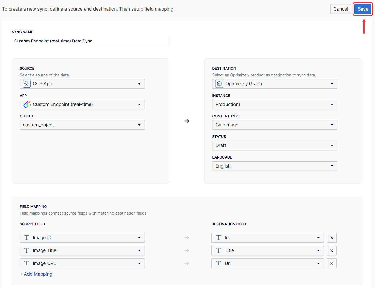 - Content Type – Select the Optimizely Graph content type to which you want to sync your data, like CMPImage.