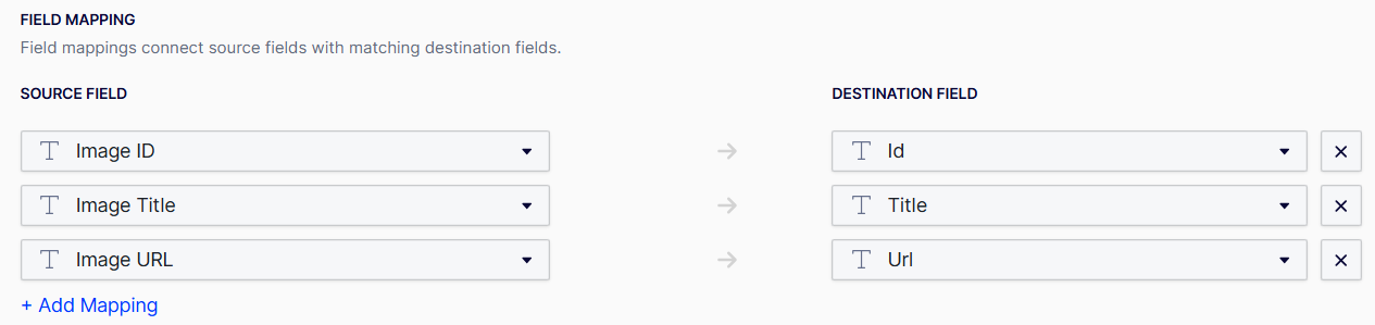 To add a field mapping, click Add Mapping, then select the Source Field and the Destination Field that you want to connect.