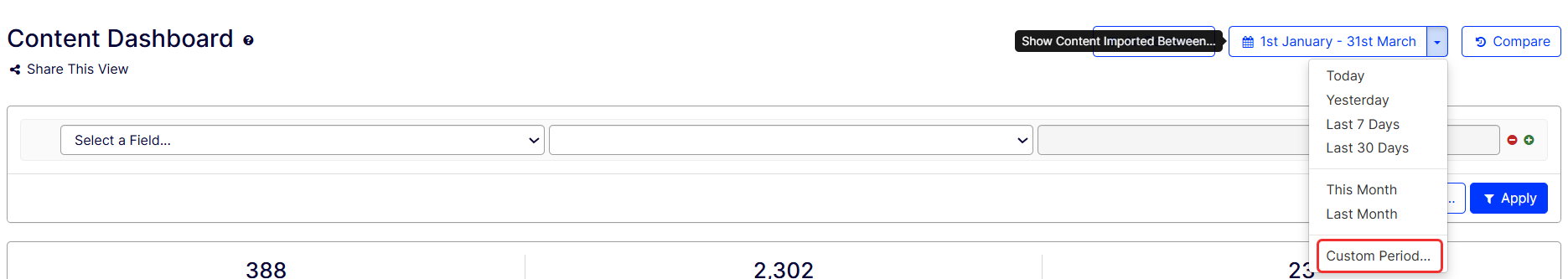 Select Custom Period from the Show Content Imported Between... drop-down list. Choose a time range between January 1 to March 31, 2025.