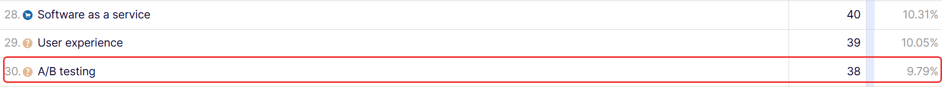 In this example, you can see A/B testing only accounts for 9.79% of the total content production in Q1 and is the 30th best-performing topic.