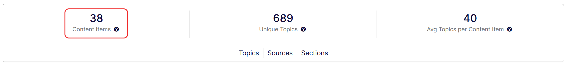 $$\text{Percentage} \;=\; \frac{\text{Content items in Q1 with selected Topic \& Section}}{\text{Total content items in Q1}} \times 100$$Using the example data and the formula above, you can calculate the percentage: