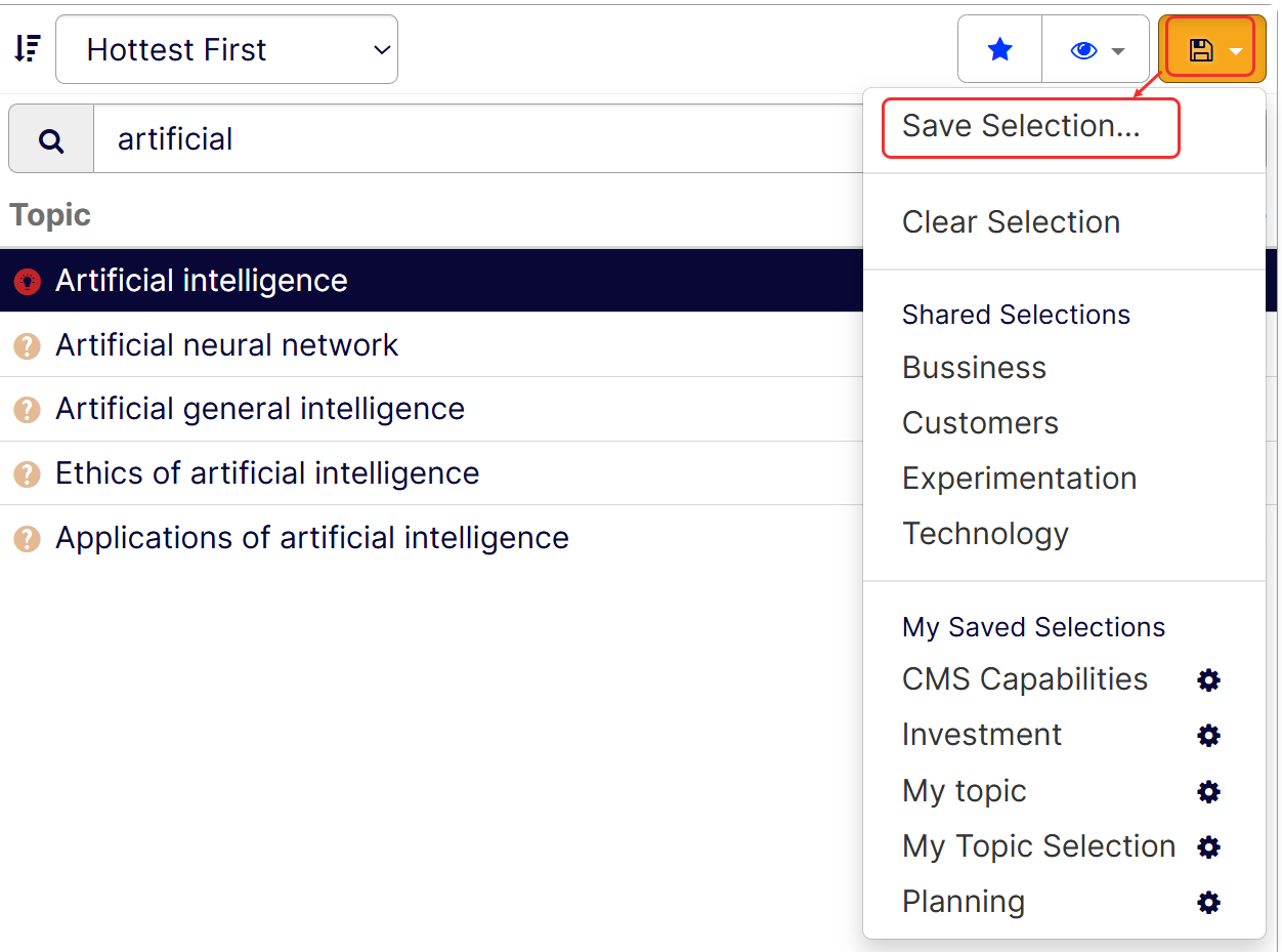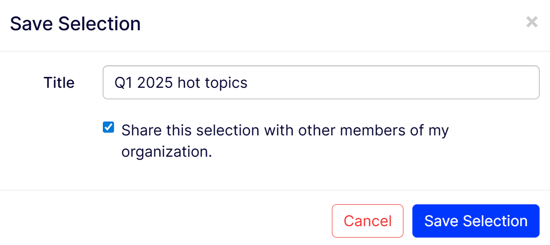 Enter a Title, for example, Q1 2025 hot topics, for the selection and click Save Selection in the dialog prompt. Select the checkbox if you want to share the topic selection with other members of your organization.