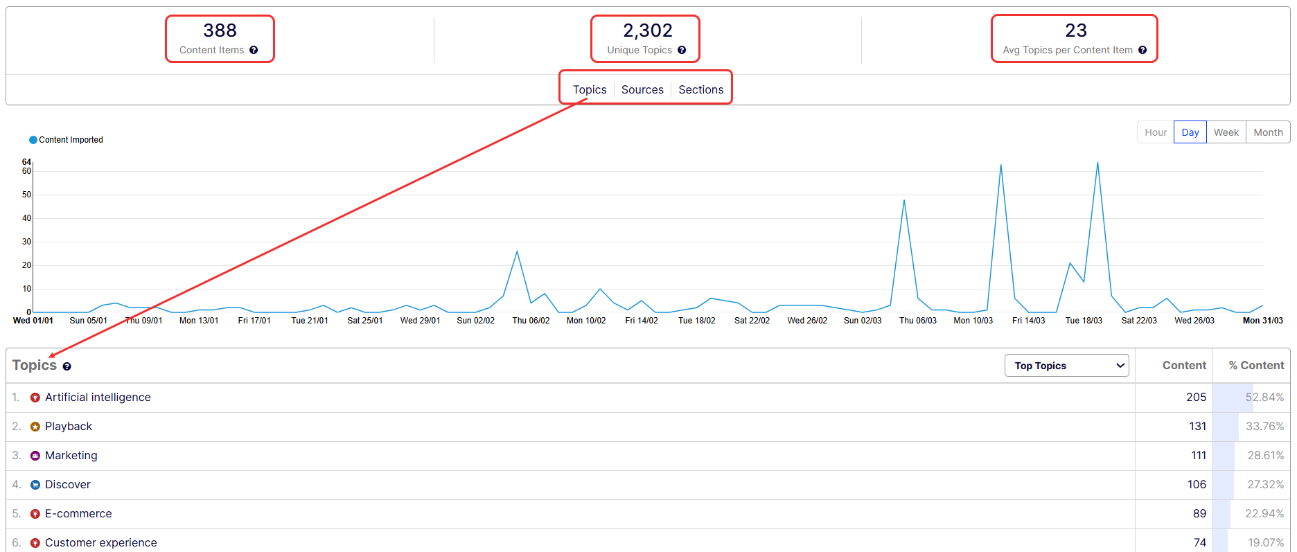 Now, you want to see how many content items containing A/B testing were processed by Content Recommendations during Q1. Scroll up to the filter section and complete the following actions: