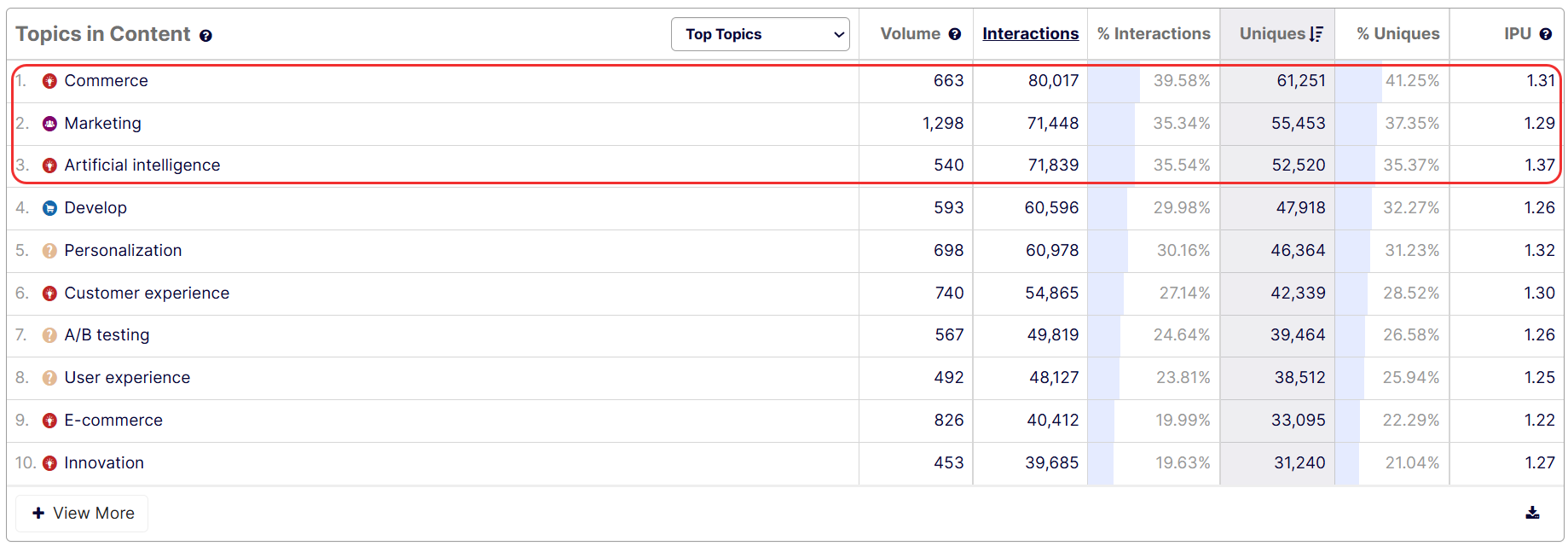 To gain more visibility into your topic's coverage, A/B testing, in the total content production, go to Content > Content Dashboard and scroll down to the Topics table to view the data for Q1. The table displays the top 10 high-performing topics for Q1. If you do not see your topic in this list, click + View More to find your topic.