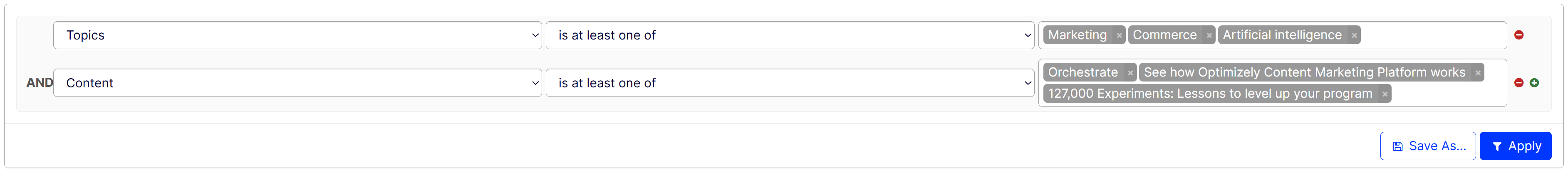 Choose the is at least one of condition and add the content pieces Orchestrate, See how Optimizely Content Marketing Platform works, and 127,000 Experiments: Lessons to level up your program from the list of content. Click Apply.