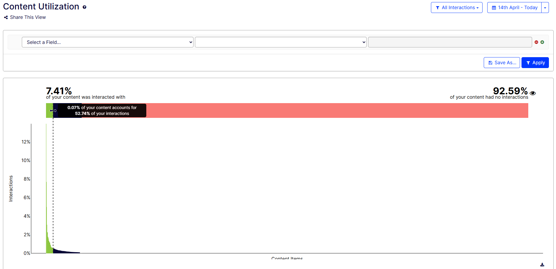 - Green section – Displays higher-performing content items. For example, 7.41% of your content was interaction with.
