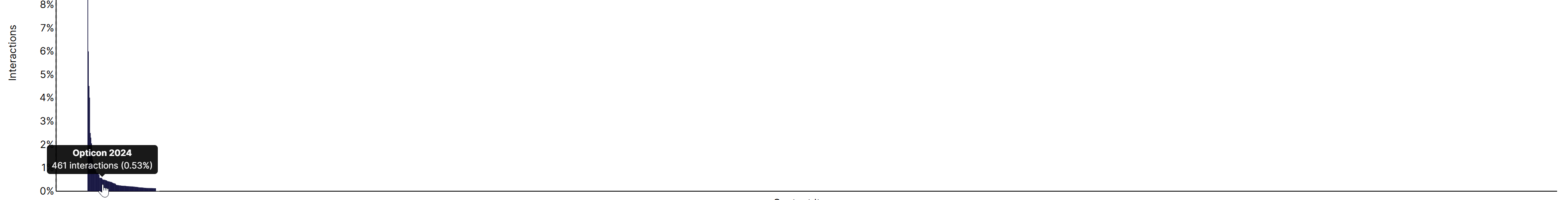 Blue bars – Displays the name of content items (for example, Opticon 2024), the number of interactions, and the percentage of interactions against the content items when you hover your cursor over the blue bars.