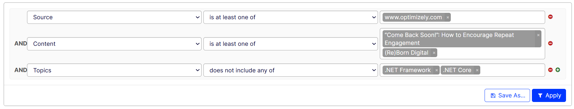 - Select the condition is at least one of and add your content in the target field, for example, Come Back Soon! How to Encourage Repeat Engagement and (Re)Born Digital.