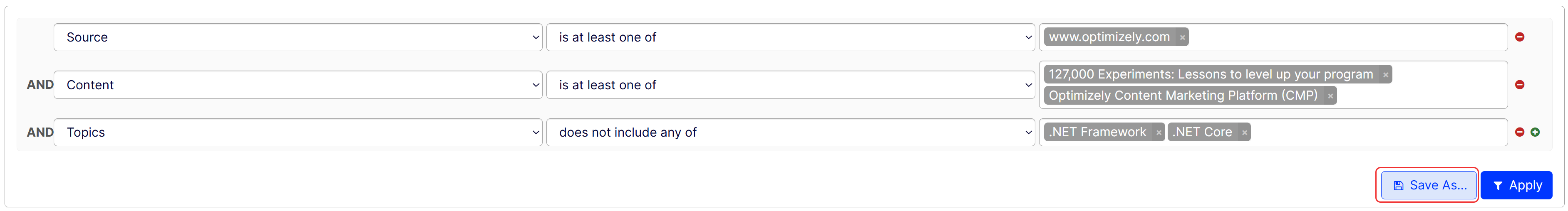 Filters in Optimizely Content Recommendation dashboards let you create granular views of data. You can configure and save filters for the dashboards inside Content, Insight, and Engage sections. Adjusting the filter alters the summary, line chart, and table data within each section to refine and focus on specific data sets. This helps you analyze your data more effectively and make informed decisions on content management activities, such as content auditing and content marketing strategy.