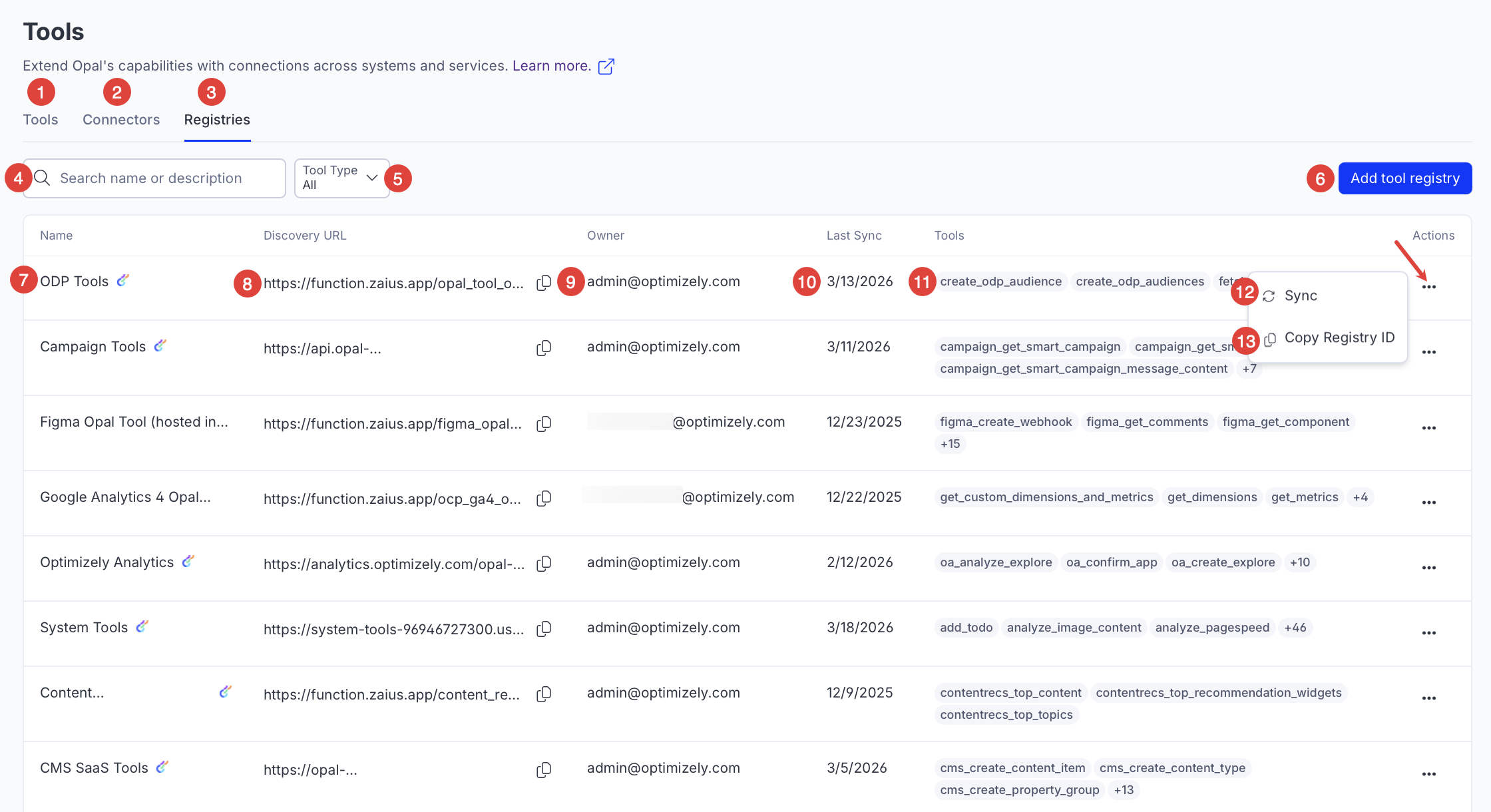 - Add tool registry – Add a custom tool registry. See Add a custom tool to Optimizely Opal.