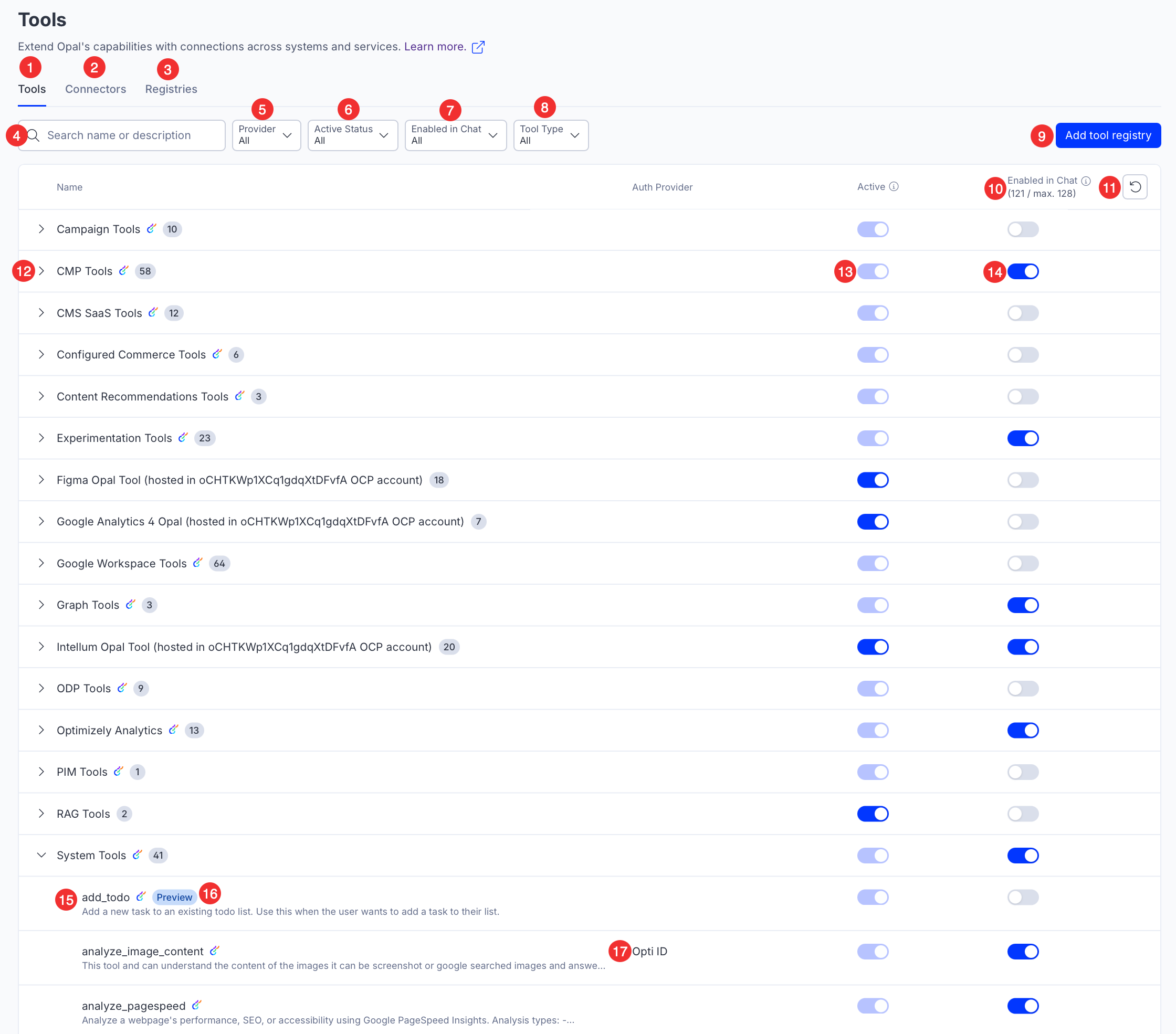- Tools – View a listing of tools in your Opal instance categorized by registry.