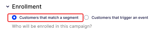 • Event-based enrollment – Enroll customers who have triggered an event, like opening an email. Event-based enrollment is only available for behavioral campaigns.