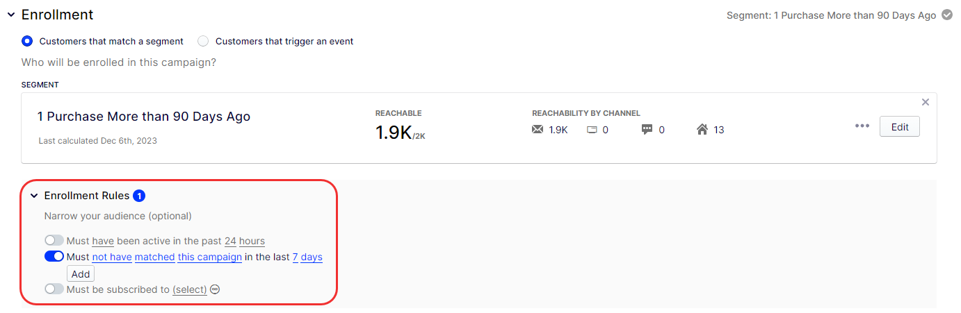 6. (Optional) Adjust the Enrollment Rules for one-time and behavioral campaigns.