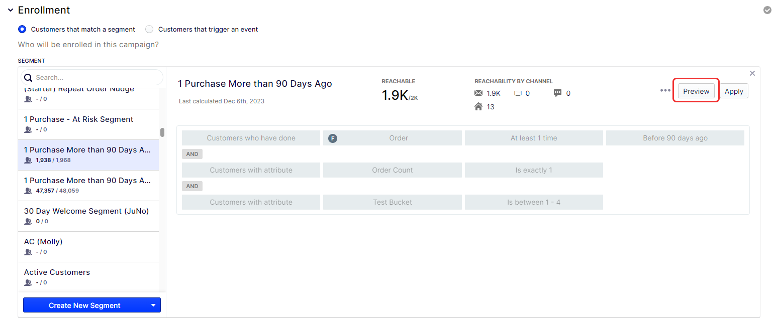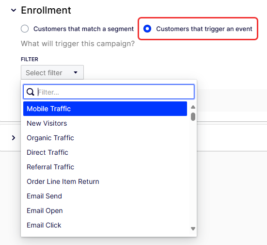 - Event-based enrollment – Enroll customers who have triggered an event, like opening an email. Event-based enrollment is only available for behavioral campaigns.