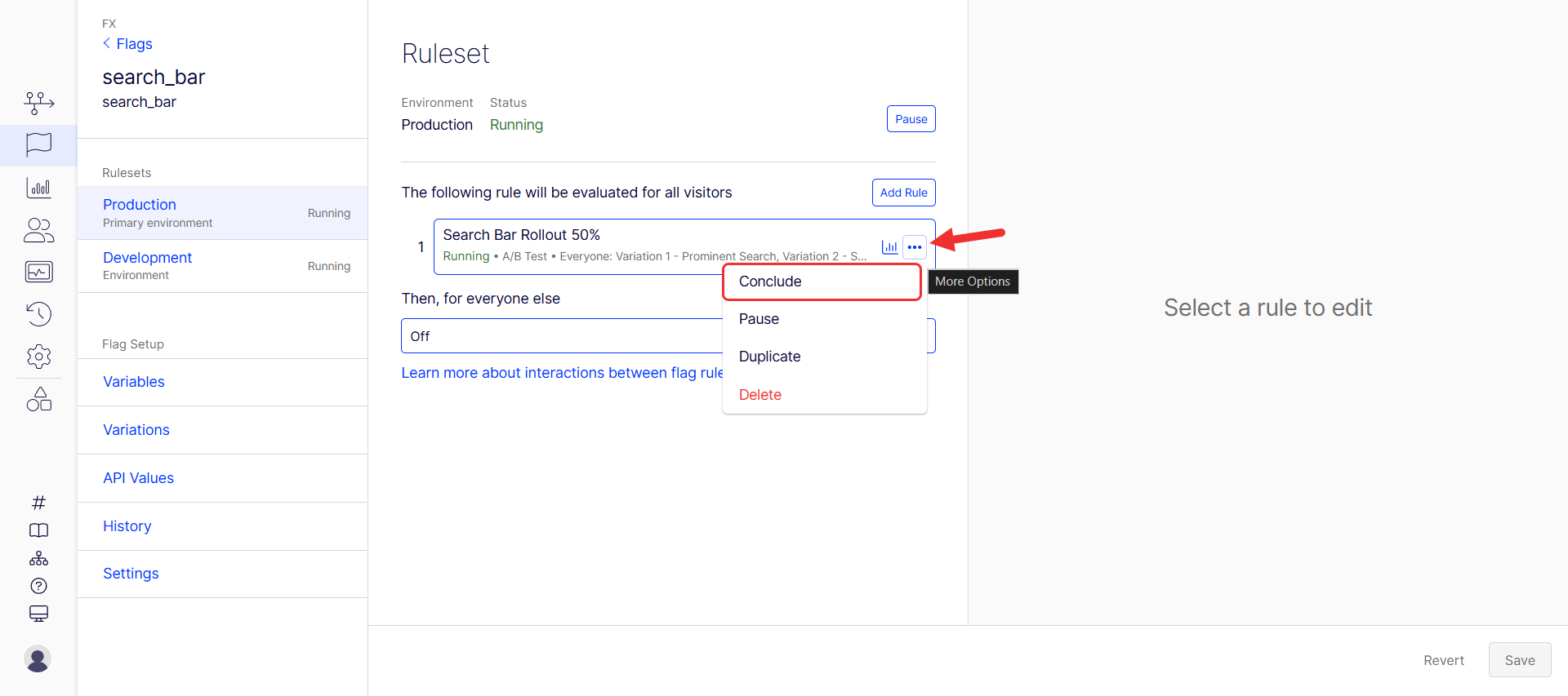 Setting a rule to Concluded ends the experiment and removes it from the datafile. Feature Experimentation stops serving variations unless you choose Conclude and deploy.
